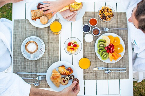 Opción 2: Una infusión caliente (te, café o café con leche), jugo de naranja, ensalada de frutas y tostadas con manteca y mermelada.